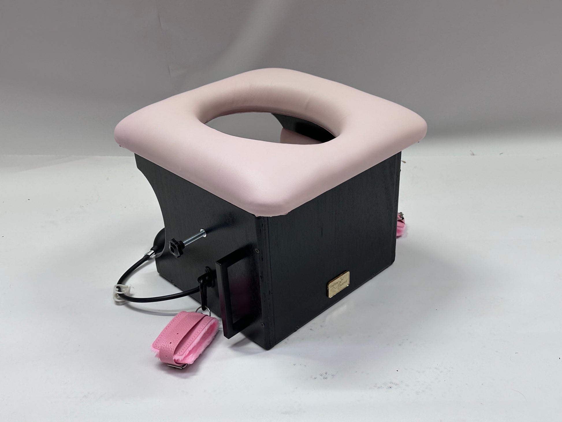Combining the enclosed structure of a traditional smotherbox with the versatility of a queening chair, this throne offers secure positioning, adjustable head clamp control, and full interior padding for comfort during extended sessions.