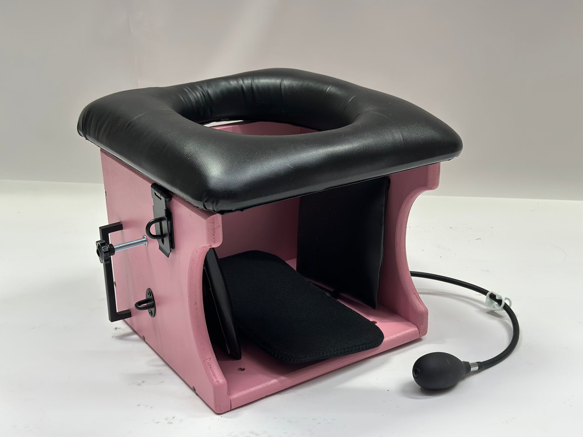 Combining the enclosed structure of a traditional smotherbox with the versatility of a queening chair, this throne offers secure positioning, adjustable head clamp control, and full interior padding for comfort during extended sessions.