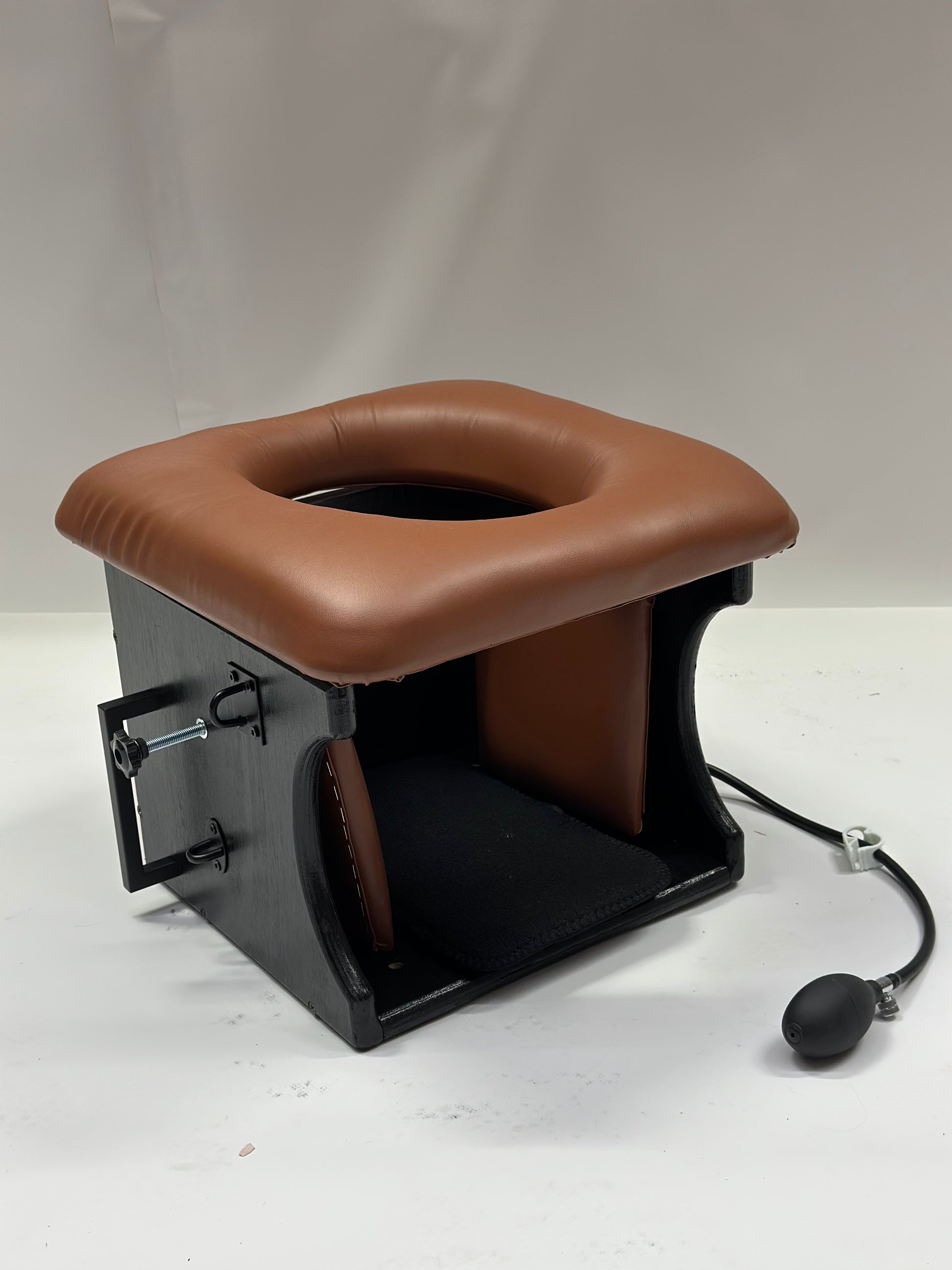 Combining the enclosed structure of a traditional smotherbox with the versatility of a queening chair, this throne offers secure positioning, adjustable head clamp control, and full interior padding for comfort during extended sessions.